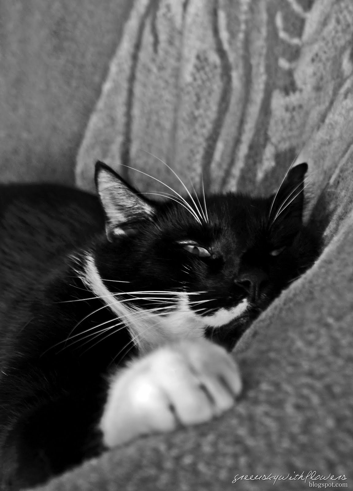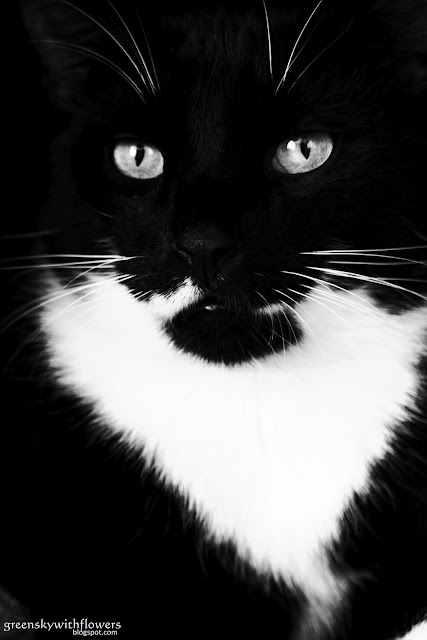 To tylko niektóre z epitetów rzucanych w stronę jegomościa widocznego na zdjęciu. Dopiero na końcu, wyjątkowo rzadko, używa się jego właściwego imienia - Sylwester. Jest z nami od ponad czterech lat. Lekko psowaty, bo potrafi chodzić na spacery niemalże przy nodze. Robi nocne samotne wycieczki po dalszej okolicy, bije się, pije wody z kałuży, jest wybredny w jedzeniu, najlepsze są myszy samodzielnie upolowane. A w ciągu dnia? Odsypia i tylko czasem uraczy przechodzącego obok człowieka nieprzytomnym spojrzeniem spod lekko przymkniętych powiek, a później przeciągnie swoje długaśne ciało i przybierze kolejną, czasem bardzo zaskakującą pozycję do spania. Niby zwykły kot, niby nic takiego. Jednak dla mnie jest ważny - nauczył mnie szacunku do zwierząt i tego, że można się zwierzakiem zachwycać :) I dlatego naprawdę warto mieć jakiegoś zwierza w domu! Ma to tez skutki uboczne - teraz wszędzie widzę i słyszę koty. Mój "detektor" kota w oczach wykryje każde kotowate siedzące na parapecie i patrzące leniwym wzrokiem na padające na chodnik ciężkie krople.