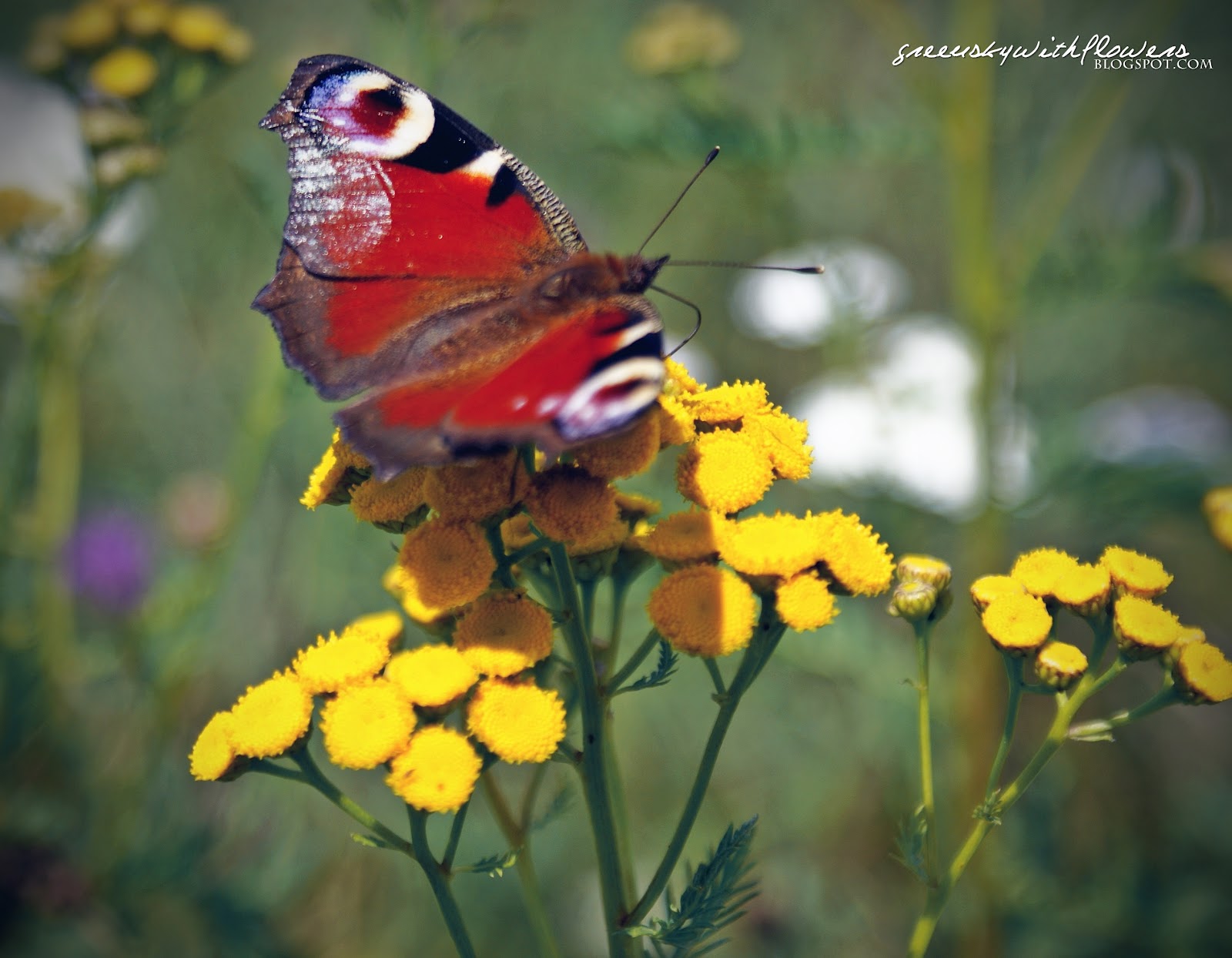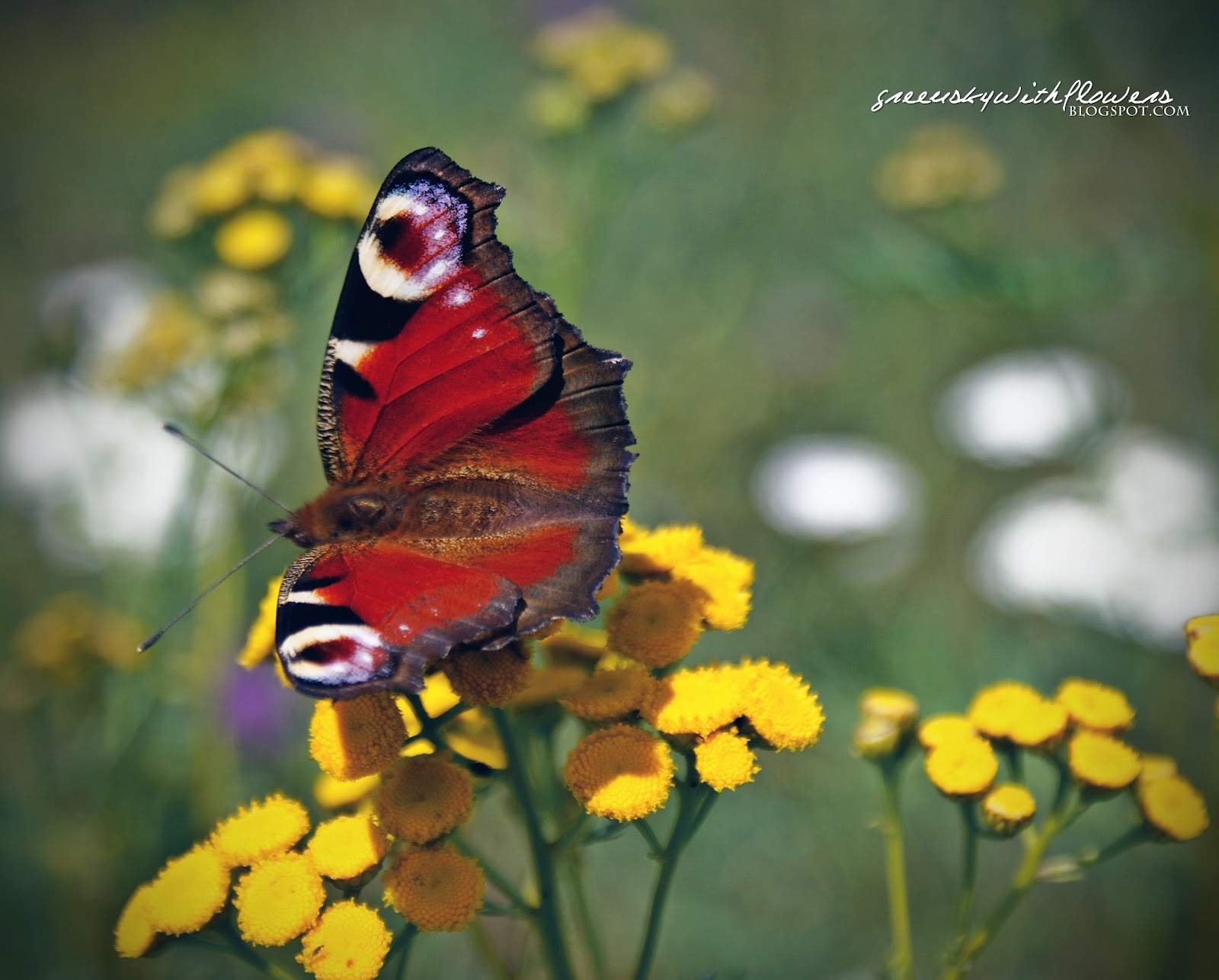 Rusałka pawik (zwany potocznie pawim oczkiem) w dwóch podejściach/ujęciach zdjęciowych. Motyl siedzi na wrotyczu, który nazywałam dawno temu guziczkami :) W tle białe parasole krwawników i chyba trochę fioletu koniczyny. Oczywiście wszystko dzieje sie na tle zielonej trawy, która tak jak wszystko inne rośnie sobie w okolicy mojego bloku na małym osiedlu w dużym mieście.