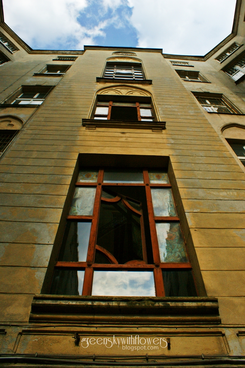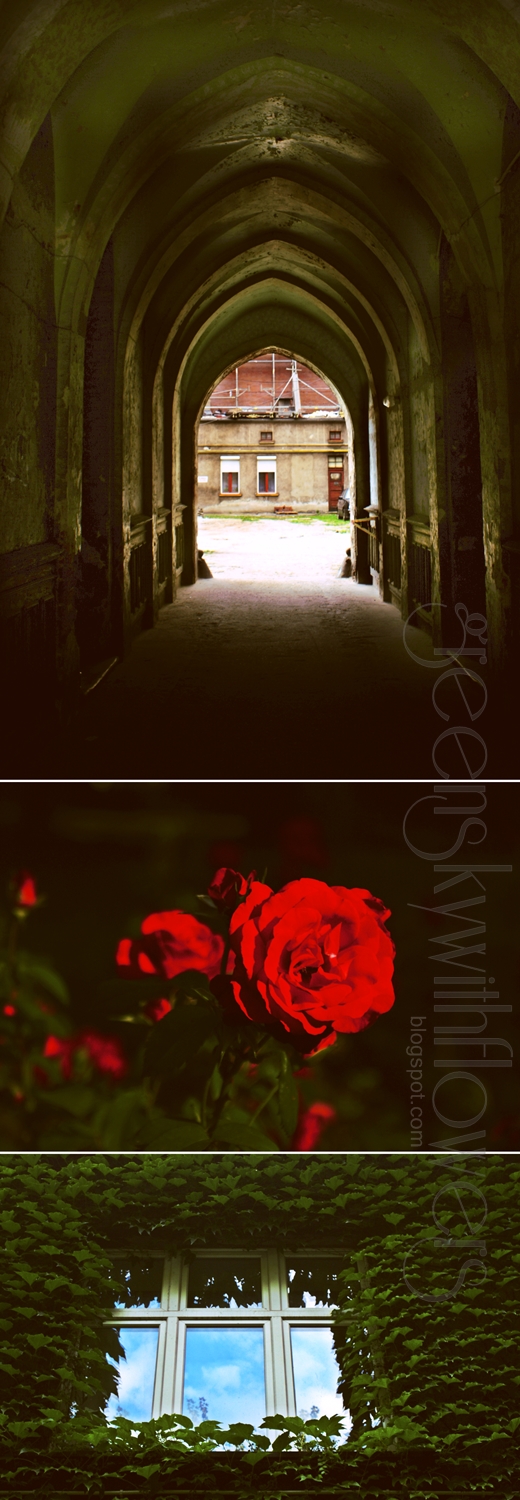 Wakacje w mieście - ciąg dalszy. Od góry: brama w kamienicy, sklepienie wygląda co najmniej jak w jakiejś gotyckiej świątyni, pośrodku: róża z parku Sienkiewicza, reprezentuje tu róże ze wszystkich łódzkich parków, które zdecydowanie umilają spacery, na samym dole: okno w domu, który znajduje się w parku Sienkiewicza.