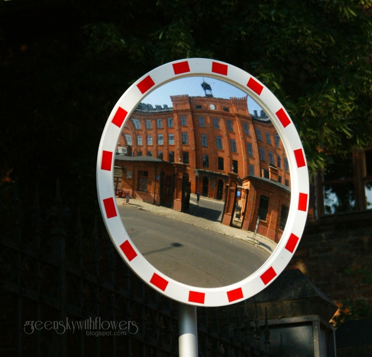 Odbicie wejścia do loftów u Scheiblera w lustrze postawionym na ulicy. Kiedyś to był to Zespół Fabryczny K. Scheiblera "Księży Młyn". Tak wyglądało to dawniej .