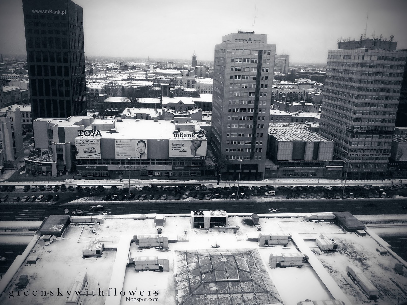 z okien wieżowca łódzkiego Manhattanu na dach kina i na miasto.